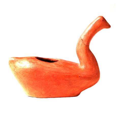 Entero, figura de un flamenco o ganso?, ave echada, con base plana cuello largo e inclinado hacia delante, cabeza y pico de tamaño pequeño. Sobre el lomo un orificio elipsoidal.