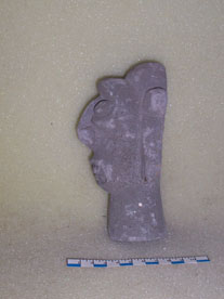 Busto litico tallado con rostro humano, Base circular plana con cuello largo ancho, rostro con orejas largas, boca grande abierta con dientes, nariz aguileña grande, ojos circulares, craneo plano en su parte posterior y aguzado en su parte alta