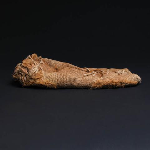 Zapato de forma rectangular, confeccionado en arpillera, cosido en la parte superior del empeine y en el talón con pita. Suela rota desgastada por el uso, abierto en la punta.