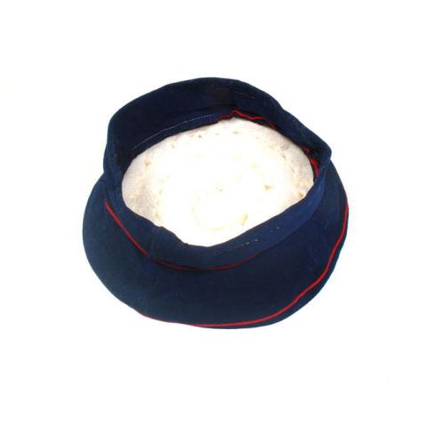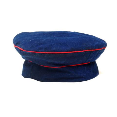 Gorra de paño color azul, achatada en su parte superior y sin visera, con un banda muy ajustada, con listado rojo en el borde central y superior de la prenda.