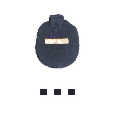 Pieza de tela negro, con bordado sobre relieve de corazón color rojo, por los bordes destellos amarillos y una cruz, en la parte superior, rodeada de flores . Al reverso, está escrita la frase:" detente el corazón de Jesús está conmigo" y bordada en hilo azul las iniciales L.V.
