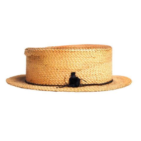 Sombrero de paja con coronilla alta y ala corta, en el borde angular lleva una cinta delgada terminada con un adorno; servía para cubrirse la cabeza.