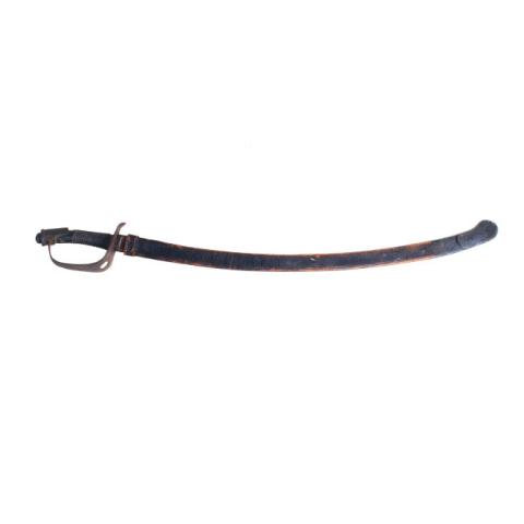 Arma blanca de mano corto-punzante, compuesta de empuñadura, hoja y vaina. Empuñadura constituida pon pomo de acero, mango de madera recubierto en cuero con una trenza de bronce que remata en una cazoleta de forma semicircular, la cual se extiende hasta unirse con el pomo formando el guardamano. Hoja de acero ligeramente curva de un solo filo. Vaina de cuero con brocal y contera de cuero.