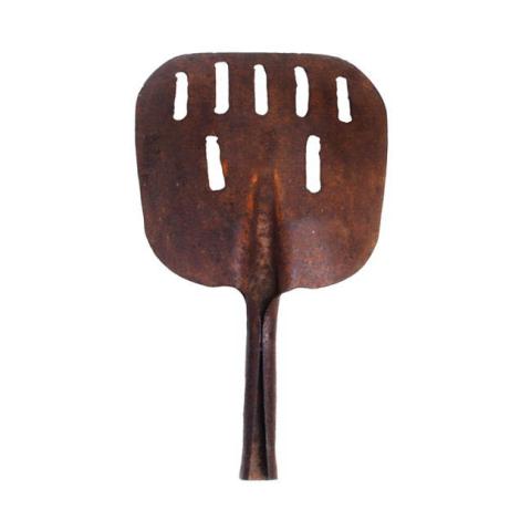 Pala sin mango, forma rectangular con extremos rectos y esquinas redondeadas, bordes levemente levantados. Posee orificios elipsoidades alargados en extremos distal (5) y mas al centro (2). Parte proximal tambien de fierro, que se ensambla con el mango se encuentra abierta