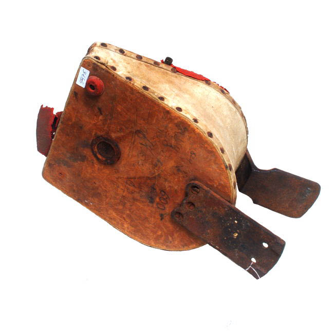Instrumento para recoger y lanzar aire con una dirección determinada, cuerpo de madera, cuero, clavos de remache y base de hierro. Costados de piel flexible con válvula por donde entra el aire y con un cañón, por el cual sale la presión del aire cuando se pliegan los costados.El conjunto de la pieza es crema, marrón y pigmento adhesivo de color rojizo.