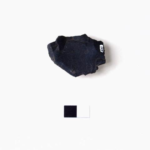 Forma ovoidal, plano- convexo. Lascado bifacial, retoque monomarginal. Corte plano convexo, color marengo