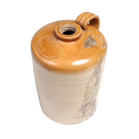 Entero, forma cilindrica con base plana y circular parte superior circular convexa cerrada con boca angosta ala centro con borde y cuello recto, un asa cinta en un costado de la parte superior. Tiene varios timbres y sellos uno dice "Made in England......" Color base y cuerpo blanquesino, parte superior, asa y boca color amarillo.