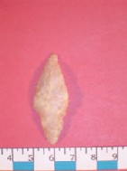 Objeto lítico entero, de forma triangular lados rectos, una cara concavo y la otra convexa, con pedúnculo grueso con un extremo agusado. Lascado bifacial con retoques bimaginal dobles aserrados.