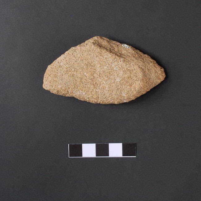 Lítico entero, elaborado de arenisca compactada. Forma romboidal, caras planas, lado levemente convexo y el otro recto. Extremos aguzados, bordes redondeados. Objeto asociado a contextos ceremoniales. Color beige.