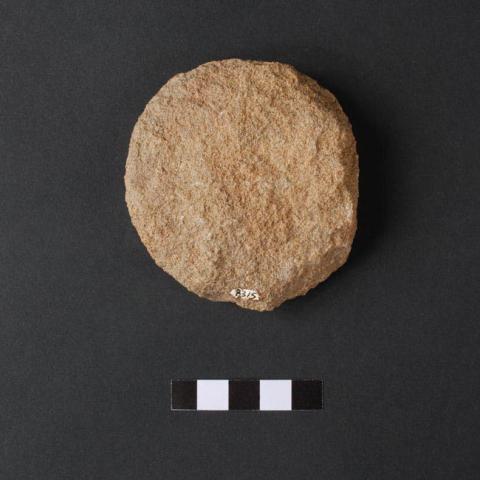 Entero. Arenisca compactada de forma discoidal, caras planas una de ellas mas irregular en superficie. Una mitad circular con bordes redondeados y otra mitad con dos rectas de bordes lisos-oblicuos.