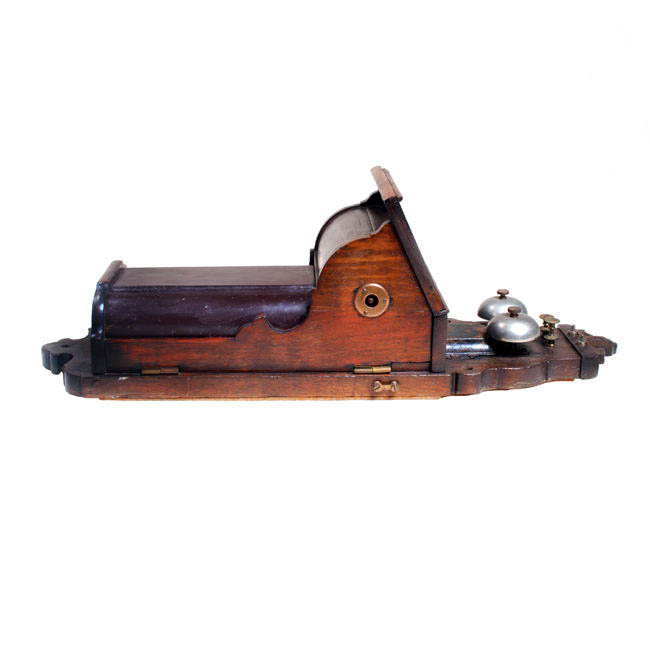 Telefono de pared, rectangular, color café; con soporte de madera y dispositivos metálicos y cable. Con dos timbres superiores y a un costado manilla giratoria y auricular colgante.