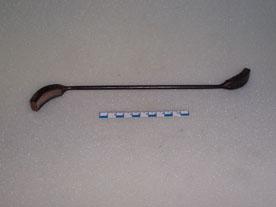 Instrumento tubular metálico, de aspecto marrón oscuro, delgado, en ambos extremos de la vara cilíndrica se encuentra una forma cóncava rectangular, que cumple la función de cuchara o recipiente para evaluar los líquidos en el proceso de lixiviación del mineral.