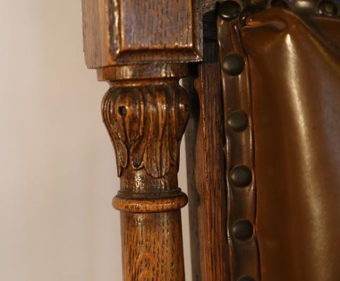 Mobiliario de asiento conocido como silla de brazos o sillón. Tiene estructura de madera y tapiz de cuero, cresta tallada recta con pináculos torneados en las esquinas.