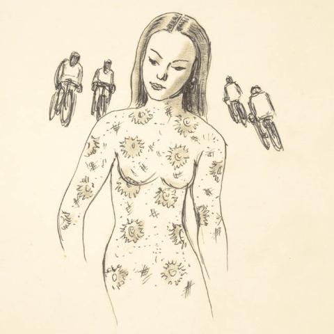 En ambos costados de su cabeza dos figuras en bicicleta.