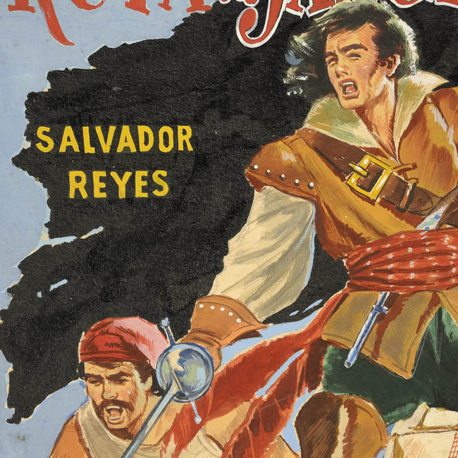 La figura de la izquierda está arrodillada, viste pantalones marrón, cinturón azul y polera sin mangas blanca, lleva un pañuelo rojo en la cabeza, tiene bigote. Lleva una espada en su mano derecha. En segundo plano detrás de la figura de pie se observa una embarcación a vela. Por delante de la figura de pie hay un objeto cilíndrico color negro dispuesto diagonalmente. En la parte superior tiene un texto escrito en rojo. Dentro del rectángulo negro en el costado izquierdo tiene un texto escrito en amarillo y otro color blanco en el interior del objeto cilíndrico negro.