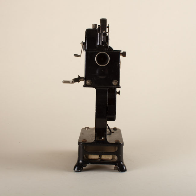 Objeto de uso recreativo. Base rectangular. Sobre ella, sección oblonga. En su parte inferior cilindro con una cara vidriada con cinta enrollada en el interior. Sobre él pieza cuadrangular con manivela metálica en un costado. En la cara posterior cilindro metálico negro y en la anterior cilindro metálico de menor diámetro. Sobre ella pieza curva con manivela metálica en el costado y cinta enrollada a la vista en la superficie.