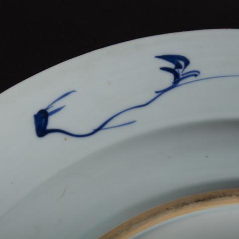 Objeto de uso decorativo. Recipiente plano cóncavo circular y color blanco, decorado en el centro con tres floreros con flores y dos objetos rectangulares. Hacia el borde se dipone una franja de meandros dispuestos horizontalmente; luego decoración con motivos florales. Borde en delgada línea ocre. En el reverso, motivos decorativos en azul.