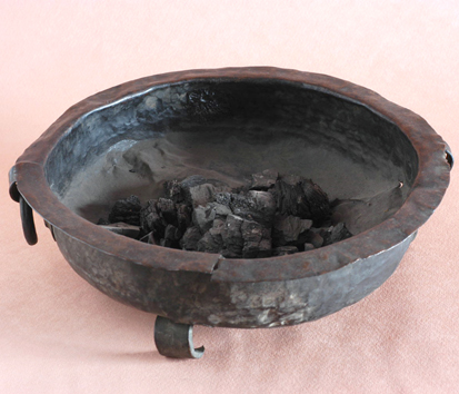 De forma circular, bordes doblados hacia afuera, 2 tomadores de argollas laterales y 3 patas arqueadas