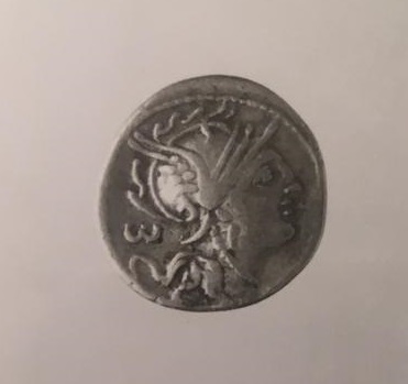 Objeto metálico de forma circular. Por el anverso aparece una cabeza femenina de perfil hacia la derecha, con casco, que representa la diosa Minerva. Por el reverso dos guerreros en combate, y dos caballos en segundo plano. Inscripción M SERVEI/A en el exergo.