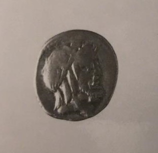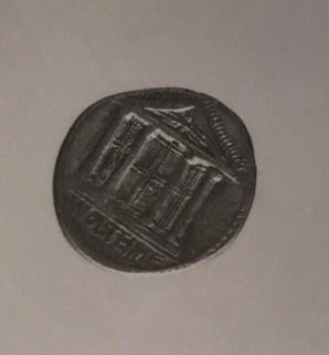 Objeto metálico de forma circular. Por el anverso aparece una cabeza masculina y barbada, de perfil hacia la derecha. Por el reverso el frontis de un edificio con cuatro columna, e inscripción en el exergo.