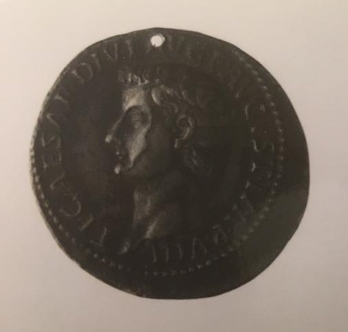 Objeto metálico de forma circular. Por el anverso aparece un busto masculino de perfil hacia la izquierda, representación de Tiberio, con leyenda circundante. Por el reverso representación de Tiberio con toga, sentado, con una patera en la mano derecha, y un asta en la derecha, y leyenda circundante. Presenta perforación en la parte superior.