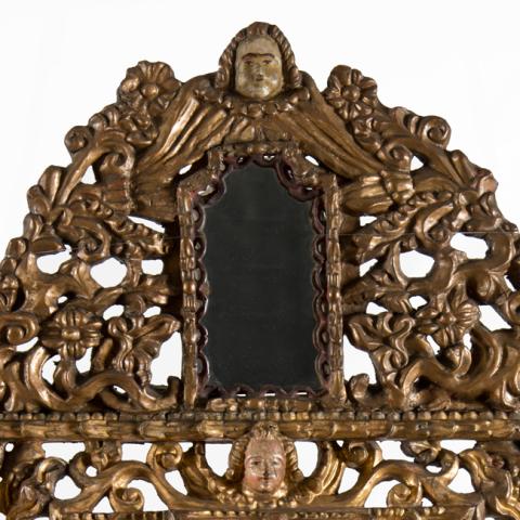 Mobiliario de formato rectangular, compuesto por un marco de madera dorado y al centro una placa de vidrio; el extremo superior tiene una coronación prominente y aguda, rematada con el rostro de un infante alado. El marco está perforado en formas intrincadas de importantes decoración con un diseño de rocallas, curvas, roleos, flores, frutos y rostros alados.