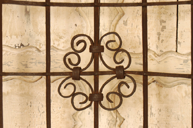 Reja con barras horizontales y verticales y decoraciòn vegetal en el extremo superior. Postigos de madera en cuatro cuadros con tallado ondulado.