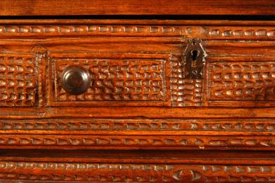 Mobiliario de apoyo, fabricado en madera de color marrón rojizo; al extremo superior tiene una cubierta rectangular de superficie llana, al frente presenta una gaveta, breve con dos tiradores esféricos y bocallave de metal. Se eleva sobre por cuatro patas talladas y torneadas en balaustre, unidas por travesaños en forma de listón, un prisma rectangular marca cada extremo y terminada en una esfera. La superficie presenta ornamentación en relieve, breves hendiduras tipo escamas realizada a golpe de gubia, técnica que se repite en toda su superficie.