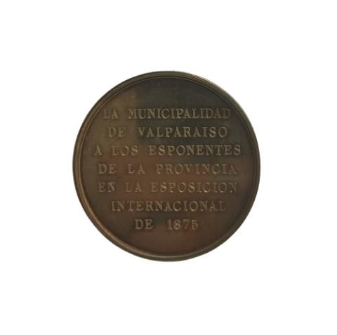 Medalla metálica de color dorado oscuro y forma circular. Por el anverso representa, al centro del campo, un escudo con estrella de cinco puntas sobre fondo estriado horizontal en la parte superior, y en la parte inferior, un barco sobre fondo estriado vertical. Sobresale, por la parte superior del escudo, un gran barco con velas cuadradas, tipo corbeta, y por la parte inferior, los brazos de un ancla, con la inscripción MUNICIPALIDAD DE VALPARAÍSO. En el exergo la marca del grabador, Alphée Dubois. Por el reverso, la leyenda LA MUNICIPALIDAD DE VALPARAÍSO A LOS ESPONENTES DE LA PROVINCIA EN LA ESPOSICION INTERNACIONAL DE 1875.