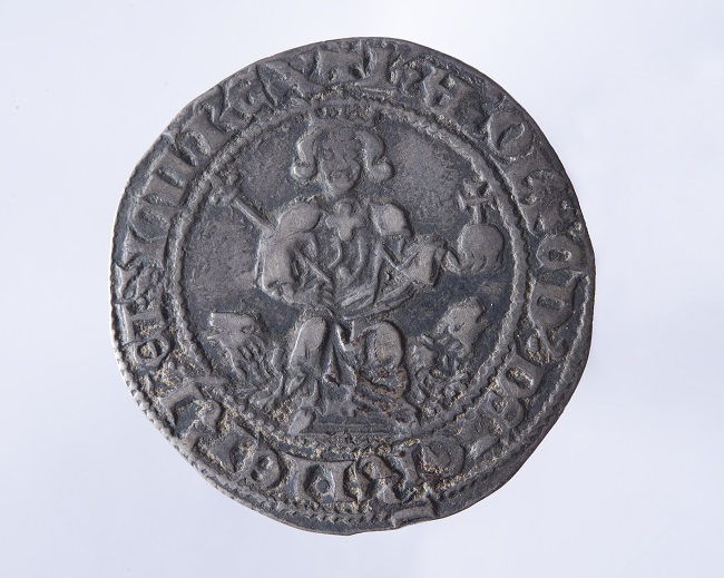 Por el anverso representa al rey coronado y vestido con un manto, entronizado de frente, sosteniendo un cetro con flores de lis en la mano derecha y un globo cruciforme en la izquierda; el trono está adornado con cabezas de leones y rodeado por la leyenda + KAROL.’ SCD.’ DEI. GRA. IERL.' ET. SICIL.’ REX.