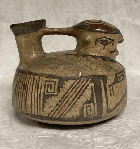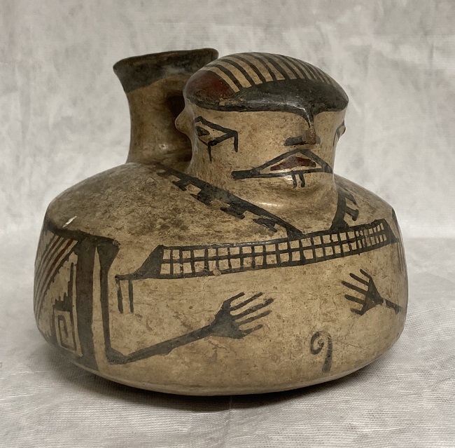 Objeto tridimensional en forma de jarro, con figura antropomorfa y asa en la parte superior. Presenta ornamentación geométrica en colores blanco, negro y rojo.