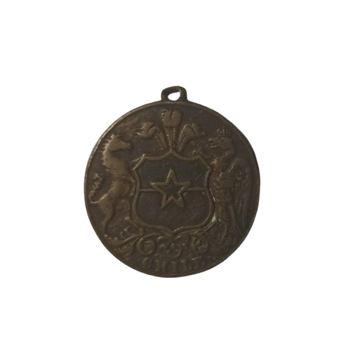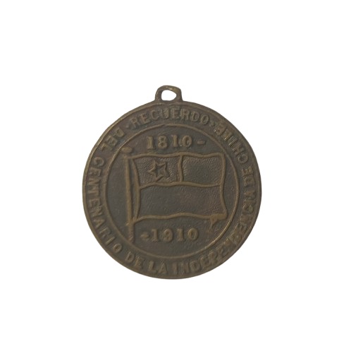 Moneda metálica de color bronce y forma circular, con una argolla en la parte superior. Por el anverso representa el escudo nacional rodeado de ornamentos y con penacho en la parte superior, flanqueado por un cóndor coronado y un caballo. En el exergo la inscripción CHILE. Por el reverso, la bandera de Chile al interior de una circunferencia, con la inscripción 1810 - arriba y -1910 abajo, rodeado por la leyenda *RECUERDO*DEL CENTENARIO DE LA INDEPENDENCIA DE CHILE.