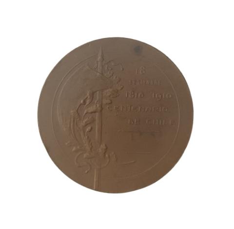 Moneda metálica de color bronce y forma circular. Por el anverso representa tres figuras humanas, una de ellas es una figura femenina de pie, con toga, gorro frigio y corona de laurel en la mano; el segundo está sentado con un recuadro en la mano; y el tercero es un niño con rama de laurel en la mano. La escena está rodeada por la leyenda EXPOSICIÓN INTERNACIONAL DE BELLAS ARTES y en la parte inferior lateral la firma F. TRAU. Por el reverso, un motivo fitomorfo que envuelve un mástil, y al costado la leyenda 18 SETIEMBRE 1810 1910 CENTENARIO DE CHILE y en la parte inferior la firma DORTSCHER.