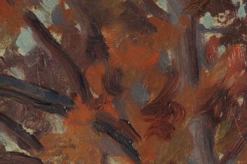 Composición en formato rectangular que representa paisaje urbano. En primer plano, una calle rodeada de árboles con hojas rojizas se proyecta hacia el horizonte. En el lado izquierdo de la composición, algunas edificaciones y una iglesia con torre. Bajo los árboles, un escaño con dos personajes sentados.