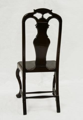 Mobiliario de asiento, de madera ensamblada; el respaldo es alto, calado, tipo violoné, nombre que se debe su forma con barra superior y faja central en curva, tiene un remate decorativo tallado y prominente; los montantes son rectilíneos. El asiento tiene un formato trapezoide, es un panel de madera, sobre puesto al bastidor, forrado en cuero. Las patas delanteras son cabriolé terminadas en cabeza de serpiente, apoyadas sobre tacón cilíndrico y las traseras a sable, rectilíneas unidas por chambrana en forma de H. Presenta decoración tallada que se ubica en el faldón, parte frontal, con figuras de rocalla.