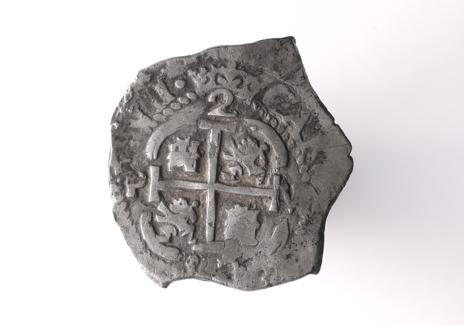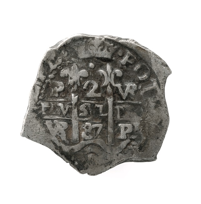 Objeto de forma irregular metálico de color plateado, compuesto por dos caras y utilizado como medio de cambio. En el anverso se observa una cuadrícula con dos líneas horizontales y dos verticales, estas últimas se coronan con una flor de lis heraldica. Cada cuadro tiene una inscripción de una letra o un número. Esta figura central se encuentra rodeada, en la parte superior, por una leyenda incompleta debido al desgaste del objeto; y en la inferior por una forma ondulada en dirección horizontal. Por el reverso, tiene representado, como tipo principal en relieve, el escudo cuartelado del Reino Español, bajo una inscripción con el número 2 coronado. Al igual que el anverso se encuentra rodeado por una leyenda desgastada.