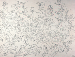 Dibujo monocromo en que se representa una serie de personajes que van entrelazándose hasta ocupar toda la superficie de la composición.