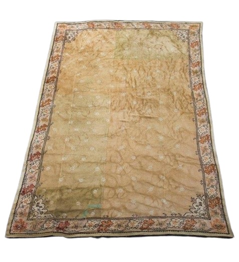 Alfombra tejida a telar con técnica de nudo y/o mecha. Fondo beige con flores blancas y, por todo el borde, una franja ancha con motivos decorativos en colores rosa, naranjo, verde y negro.
