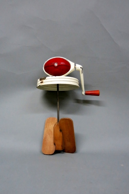 Objeto de plástico, metal y madera, se constituye por una tapa de plástico blanca y rojo, con un pomo en la parte superior y una manilla al costado. En la parte inferior un cilindro delgado en la centro que sostiene al extremo tres placas de madera movibles.