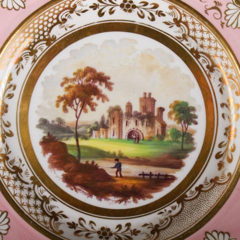 El segundo objeto corresponde a un objeto de uso doméstico. Recipiente blanco, cóncavo circular, de borde en ondas y con asas caladas en dos extremos. Al centro y rodeado de franja dorada, una vivienda con torres rodeada de pasto, con un gran árbol y bajo el, un hombre. Rodea la imagen una franja decorada en dorado con motivos geométricos y florales. En el borde, inscripción de letras en dorado con decoración floral. Borde blanco en sobrerelieve decorado con dorado.