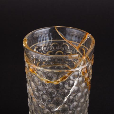 Objeto de uso doméstico elaborado en vidrio transparente. Contenedor cilíndrico de base plana y borde redondeado. En la superficie semi círculos en sobre relieve.