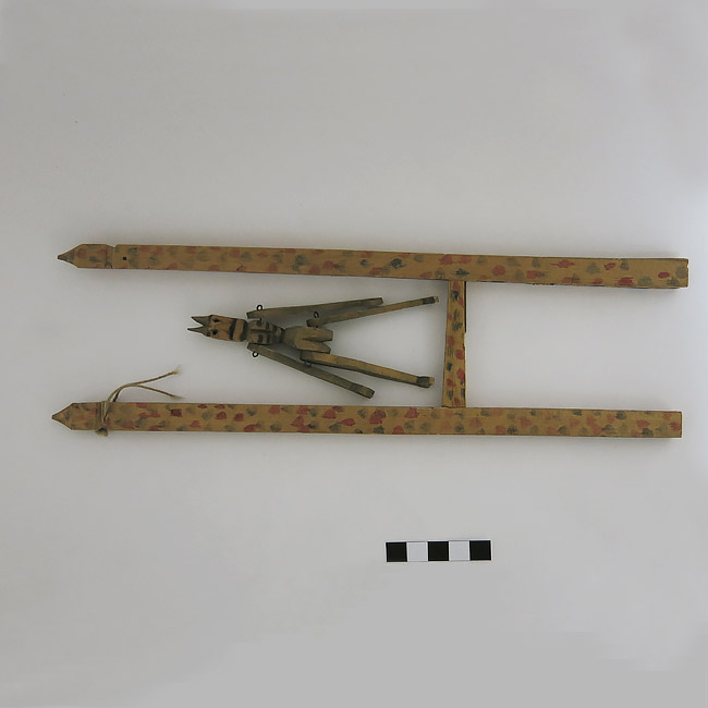 Objeto recreativo, está compuesta por dos listones cuadrangular y paralelos, con un personaje masculino al centro. La figura tiene ensambles metálicos y cuerdas en las extremidades que le permiten un movimiento articulado.