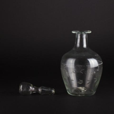 Objeto doméstico elaborado en vidrio transparente. Contenedor de cuerpo globular cuello corto de boca restringida, labio plano de borde redondeado y base plana. En la superficie, decoraciones fitomorfas empavonadas. Al interior del cuello, tapa de parte superior cilíndrica, centro acinturado y parte inferior apuntada.