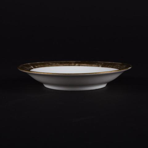 Objeto de forma circular. De color blanco, con borde de color dorado, al centro tiene un circulo dorado.