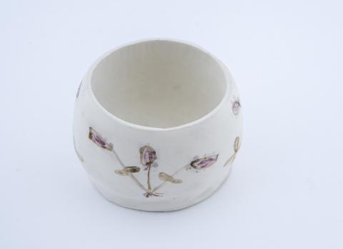Objeto decorativo compuesto por dos partes. La inferior es de forma cilíndrica y paredes curvadas, de color blanquecino. La parte superior es una tapadera circular y abovedada, presenta en su extremo superior un tomador con forma de ave en descanso. Ambas partes presentan decoración en diseño figurativo y estilizado, de colores magenta y verde.