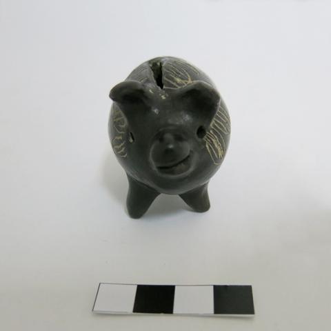 Objeto decorativo, es una figura zoomorfa, con aspecto de cerdo; de volumen globular y color negro con ornamentación blanca. Posee cuerpo abultado con una pequeña ranura en el lomo, en la zona frontal destaca su cabeza erguida, el relieve de las orejas largas curva, que se prolongan hacia arriba, también su trompa prominente, hocico agudo y dos perforaciones circulares forman los ojos; en la parte posterior un breve relieve forma su cola. Se eleva sobre tres patas cónicas . Presenta decoración en diseño figurativo esquemático, líneas blancas, ubicadas sobre el cuerpo; el acabado es pulido brillante, homogéneo.
