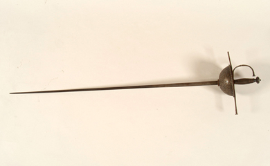 Arma blanca compuesta por una hoja larga estilizada y aguda; al extremo inferior presente una cazoleta circular y abovedada. La empuñadura es recta, breve y al extremo lleva un pomo cilíndrico, y el guardamanos en forma curva, se eleva en forma paralela al mago. Presenta decoración perforada en figurativo, hojas y roleos, ubicada en la cazoleta.