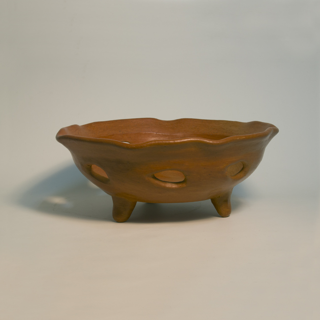 Objeto de uso doméstico, destinado para disponer frutas en la mesa. Es un volumen cóncavo de color marrón rojizo; al extremo superior, tiene una amplia abertura circular de borde divergente recortado en secciones curvas. El cuerpo tiene paredes breves de perfil curvo y presenta perforaciones circulares; la base es cóncava y se eleva sobre tres patas cónicas.