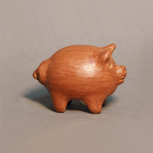 Objeto decorativo, es una representación zoomorfa, cerdo pequeño, de cuerpo globular y color marrón rojizo. Al extremo superior una curva define el lomo y en la parte frontal se destaca el relieve de las orejas prominentes y la trompa; un par de orificios circulares forman los ojos. Al extremo posterior, un relieve circular forma su cola enroscada. Se eleva sobre cuatro patas breves.