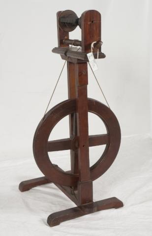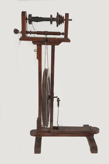 Instrumento mecánico compuesto principalmente por un pedal, una rueda y una correa. Su función es transformar fibras textiles en hilo a través de la torsión y el enrollado. El pedal acciona la rueda, lo que provoca que la fibra se tuerza y que el hilo resultante se almacene en una bobina.